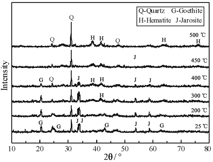 从图 4可以看出,当温度达到200 ℃时,样品中各衍射峰没有发生变化,表明在200 ℃以下,没有发生物相转变,继续升温至300 ℃,针铁矿的部分衍射峰(24.7°、42.8°、62.7°)明显减弱,开始出现赤铁矿的衍射峰,表明此阶段针铁矿开始脱羟基向赤铁矿转变,随着温度的继续升高,针铁矿的衍射峰逐渐消失,赤铁矿的衍射峰逐渐增强,在450 ℃时,针铁矿的衍射峰完全消失,表明此时针铁矿脱羟基过程已经完成,褐铁矿脱水反应基本结束,继续升温至500 ℃,赤铁矿的衍射峰不断增强、矿相逐渐变纯。另外,从图 4中可以看出,随着温度的升高,脉石矿物黄钾铁矾的衍射峰也在不断的减弱,黄钾铁矾的分解可能会对褐铁矿脱水反应过程中的热量变化造成一定的影响。