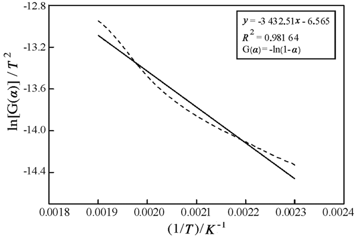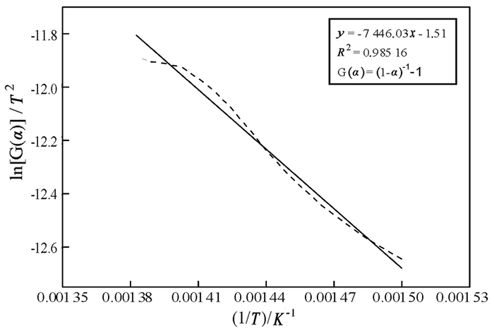 表 3是不同化学反应机制的动力学机理函数[11]。将不同机理函数的G(α)和各温度下的转化率α代入公式(5),建立ln[G(α)/T2]与1/T的直线关系,使用origin软件进行最小二乘法线性拟合,线性相关性系数最大的即为该反应的最概然机理函数,然后通过拟合直线的斜率(-E/R)和截距(ln(AR/βE))即可求出该反应的动力学参数:活化能E和指前因子A。