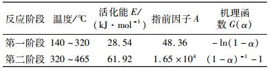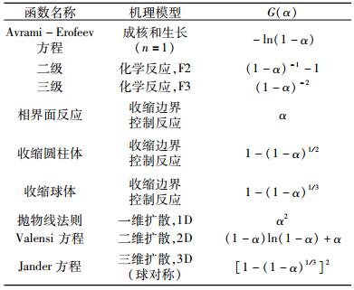 式中:T为反应温度;β为升温速率;A为指前因子;E为活化能;R为普适气体常数(8.314 5 J·mol-1·K-1);f(α)、G(α)为反应的机理函数。