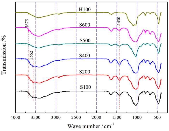 FTIR检测(见图 2)表明,S100、S200和S400具有的对应于海泡石结晶水伸缩振动的3 562 cm-1吸收峰[9]在S500和S600中消失,但对应于结构水的3 675 cm-1吸收峰在后者中更明显; 酸化样品H100中不仅没有3 562 cm-1吸收峰,也缺失其他样品都有因C-O键振动引起的吸收峰(1 430 cm-1)。这说明经≥500 ℃热处理后,海泡石相的结晶水均已烧失,而属于海泡石相与滑石相[10]共有的结构水仍然保留; 经15 %盐酸60 ℃处理8.5 h后,海泡石晶体结构中的Mg被H大量取代,使与Mg络合的结晶水脱失,方解石相也酸解消失。