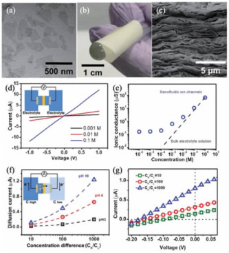 | 图 10 (a) 剥离蒙脱石纳米片TEM测试图;(b)CTAB改性蒙脱石纳米片重组装制备的具有二维通道的柔性薄膜(RMM);(c)RMM截面层状结构SEM测试图;RMM离子传输特性测试:(d)在不同浓度KCl溶液中的Ⅰ-Ⅴ曲线(e)电解质浓度与质子传导效率间的关系;RMM能量转化测试:(f)不同pH条件下歌浓度梯度产生的扩散电流(g)不同浓度梯度(1,10,100)下的Ⅰ-Ⅴ曲线[62] Fig.10 (a) TEM images of exfoliated MMT nanosheets; (b) Flexible film (RMM) with two-dimensional channel prepared by CTAB modified montmorillonite nanosheets; (c) SEM morphology of RMM cross-section layered structure; (d) Ⅰ-Ⅴ curve of different concentrations of KCl solution in RMM ion transmission characteristic test; (e) Relationship between electrolyte concentration and proton conduction efficiency in RMM ion transmission characteristic test; (f) Ⅰ-Ⅴ curve of diffusion current generated by each concentration gradient in different pH conditions in RMM energy conversion test; (g) Ⅰ-Ⅴ curve at different concentration gradients (1, 10, 100) in RMM energy conversion test[62] |