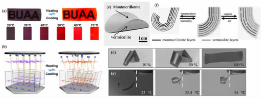 Cheng等[69]人设计了一种蒙脱石基热变色材料,通过氢键连接将戊二醛酸(PCDA)单体涂布在蒙脱石二维纳米片上,在254 nm紫外光照射下PCDA单体自聚合成聚戊二醛酸并与(3-氨丙基)三乙氧基硅烷(APTES)交联,最终获得了具有可逆热致变色特性的MMT/poly-PCDA/APTES杂化膜(图 11a),其热变色机理是由于侧链在升温或降温过程中的热运动导致层间聚合物链共轭长度的延长和缩短(图 11b)。除颜色改变外,材料形变是也是一种常用的刺激响应形式,Gogoi等[70]人将剥离后的蒙脱石纳米片和蛭石纳米片复合制备了一种新型的刺激响应双层黏土薄膜(clay-clay bilayer membrane, CCBM)(图 11c)。发现所制备的CCBM在暴露于各种蒸气(包括甲醇、丙酮、四氢呋喃、乙醇、2-丙醇和乙酸乙酯)后均会发生形变。此外,不同的大气湿度(图 11d)和环境温度的波动(图 11e)刺激下,CCBM均相应表现出不同的形变特征,这是由于CCBM两侧两种黏土矿物对湿度和温度刺激的响应程度不同而使其表现出特异性响应环境刺激的形变效果(图 11f)。