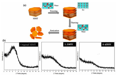 | 图 3 (a) 超声-冷冻解冻法循环剥离蒙脱石示意图;(b)未剥离蒙脱石和超声-冷冻/解冻循环剥离后的蒙脱石XRD图谱[32] Fig.3 (a) Schematic of cyclic exfoliation of montmorillonite by ultrasonic-freeze thawing method; (b) XRD patterns of montmorillonite after exfoliation without exfoliation and cyclic exfoliation by ultrasonic-freezing / thawing method[32] |
