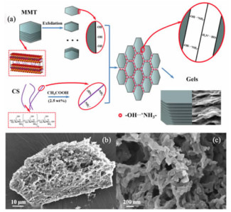 | 图 4 (a) 蒙脱石二维纳米片与壳聚糖自组装制备水凝胶机理图及(b,c)水凝胶的三维网状结构[36] Fig.4 (a) Mechanism of self-assembly of montmorillonite two-dimensional nanosheets and chitosan to prepare hydrogel; (b, c) Three-dimensional network structure of hydrogel[36] |