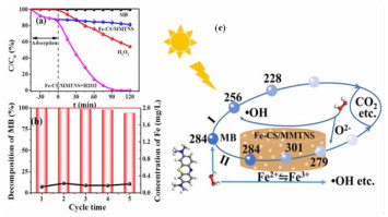 | 图 5 (a) 铁-壳聚糖/蒙脱石自组装凝胶对亚甲蓝的吸附和降解去除率,pH=3;(b)铁-壳聚糖/蒙脱石自组装凝胶循环性能;(c)铁-壳聚糖/蒙脱石自组装凝胶吸附/光芬顿反应协同降解亚甲基蓝机理图[40] Fig.5 (a) Adsorption and decomposition of MB by self-assembly Fe-CS-MMTNS gel, pH=3; (b)Recyclability of self-assembly Fe-CS-MMTNS gel; (c) Schematic diagram of MB decomposed by synergistic effect of adsorption and photo-Fenton reaction by self-assembly Fe-CS-MMTNS gel[40] |