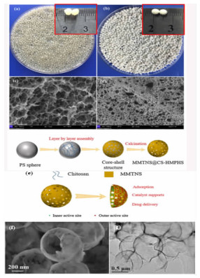 在MMTNS-CS水凝胶的基础上,作者团队王伟[41]等人继续利用二维蒙脱石纳米片制备了一种多孔有机高分子复合材料(Porous organic polymer,POP),即采用聚乙烯醇(PVA)、海藻酸钠(SA)和壳聚糖(CS)与蒙脱石纳米片复合制备直径约3 mm的凝胶微球(图 6a,b)。凝胶球内部可看到均匀分布的微孔结构(图 6c,d),蒙脱石纳米片起到了骨架支撑作用,且对MB同样具有很好的吸附去除效果。陈鹏等[42]人则是首先将CS负载在聚苯乙烯(polystyrene,PS)微球表面,然后将表面修饰的PS颗粒浸入剥离后的蒙脱石纳米片分散液中,通过层层自组装形成核-壳结构,之后通过煅烧去除PS内核得到中空的壳聚糖-蒙脱石球形外壳(MMTNS@CS-HMPHS)(图 6e-g)。制备的蒙脱石球状外壳表面具有通向内部的介孔通道,球壳内部因与壳聚糖结合而具有与外表面不同的活性位点;其大比表面积和差异性的活性位点分布可用于吸附和用作催化剂载体等。