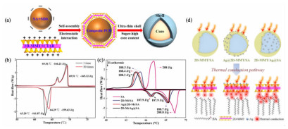 | 图 7 (a) 二维蒙脱石-硬脂酸相变储能材料制备及结构示意图;(b)MtNs-SA的DSC曲线和(c)引入AgNPs后先变材料的DSC曲线;(d)AgNPs分布位置与对应传热路径示意图[46-48] Fig.7 (a) Preparation and structure of two-dimensional montmorillonite-stearic acid phase change energy storage material; (b) DSC curves of MtNs-300/SA PCM; (c) DSC curve of the material first changed after the introduction of AgNPs; (d) Schematic diagram of AgNPs distribution locations and corresponding heat transfer paths[46-48] |
