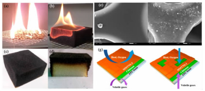 | 图 8 (a) FPU和负载蒙脱石后(b)FPU燃烧以及负载蒙脱石FPU燃烧后的(c)表面与(d)截面图;(e)FPU和(f)负载蒙脱石纳米片后的FPU的SEM形貌图;(g)不同厚度蒙脱石层阻燃机理示意图[51] Fig.8 (a) Surface of FPU combustion process; (b) Surface of FPU combustion process after loading montmorillonite; (c) Loaded montmorillonite FPU surface after combustion; (d) Loaded montmorillonite FPU cross-section after combustion; (e) SEM morphology of FPU; (f) SEM morphology of FPU after loading montmorillonite nanosheets; (g) Schematic diagram of flame retardant mechanism of montmorillonite layers with different thickness[51] |
