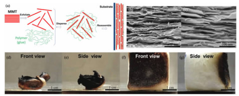 陈鹏等[51]人通过层层自组装的方法用壳聚糖连接将二维蒙脱石纳米片负载在聚氨酯(FPU)泡沫表面,蒙脱石纳米片能在FPU表面形成致密完整的蒙脱石膜阻隔氧气和挥发性气体的释放并抑制热传递从而达到更佳的阻燃效果,极大提升了聚氨酯泡沫的阻燃性(图 8)。Ding等[52]人通过模仿天然珍珠层的无机-有机层状结构,将链状有机高分子聚乙烯醇树脂(PVA)和聚对苯二甲酸乙二醇酯(PET)作为连接剂与二维蒙脱石纳米片层自组装制备了一种纳米仿生层状材料。在这种有序的均匀插层体系中蒙脱石不仅作为结构骨架提供强度,而且表现出了优异的阻燃能力(图 9)。