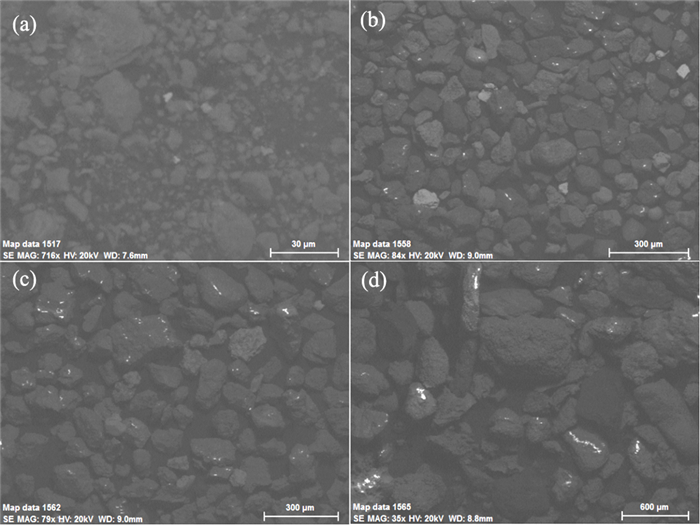 | (a)the original sample of soil; (b)the heavy parts after washing; (c)the second heavy parts after washing; (b)the light parts after washing 图 2 样品区域显微形貌图 Fig.2 The area micro-structure of the sample |