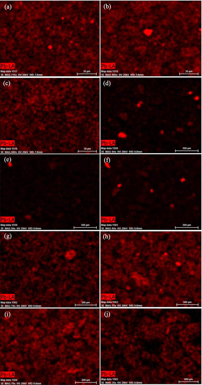 由图 3中(a)~(c)可知,在面扫描背景曝光较强的条件下才能偶见球形、方形含铅物质;由图 3中(d)~(f)可知,土壤样品经淘洗后,重部分样品中Pb元素分布非常集中,主要以球形、方形、不规则形等零散分布,说明淘洗可以去除灰尘状等细粒级、微细粒级含铅污染物;由图 3中(g)~(i)可知,土壤样品经淘洗后,次重部分样品中Pb元素分布相对分散,主要以星点状、絮团状分布,偶见球形、方形含铅物质;由图 3中(k)可知,土壤样品经淘洗后,轻重部分样品中没有发现球形、方形或不规则形等含铅物质。