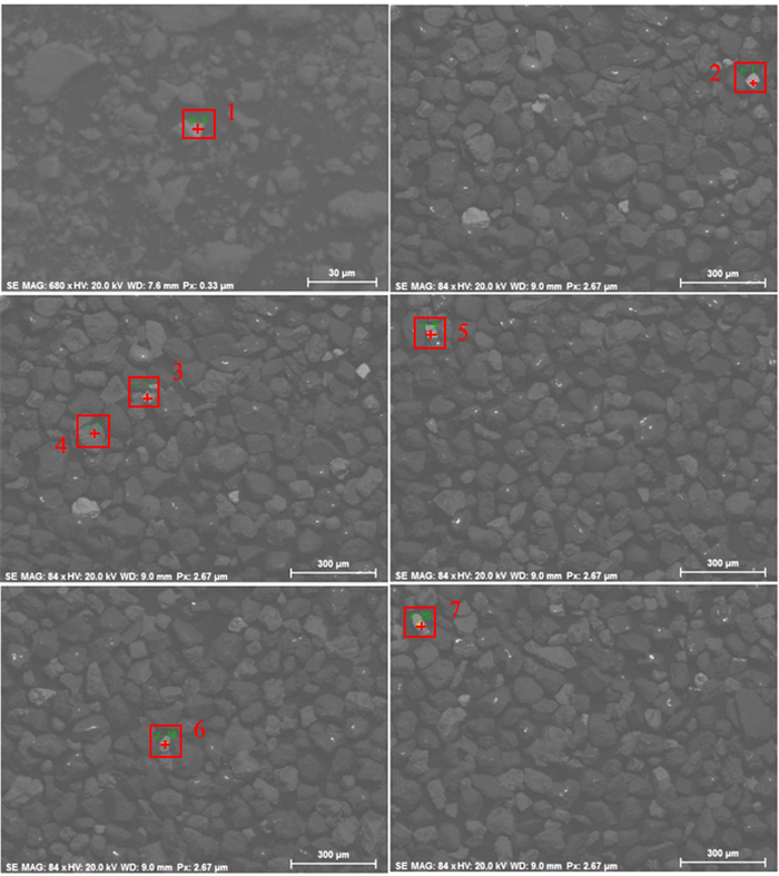 由图 2可知,土壤样品颗粒之间相互黏结呈絮团状聚体,颗粒之间界面并不分明,各颗粒表面污浊,主要以细颗粒为主,粒度分布相对均匀;土壤样品经淘洗后,土壤颗粒之间界面分明、独立存在,颗粒表面较为干净,但并不光滑;样品中偶见方形、球形颗粒。