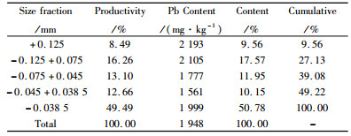 2.4 粒度分布将土壤样品配制成质量浓度20%的泥浆,对其进行超声分散,然后选择标准筛进行湿式筛析,筛析结果见表 2。由表 2可知,土壤主要以-0.038 5 mm粒级存在,占49.49%,粒度较细;从各级别含量分析,Pb在各级别含量基本相当、变化不大,没有明显的富集,说明铅粒度分布较为均匀,主要原因可能是细颗粒、微细粒级含铅污染物均匀分散的吸附在土壤颗粒表面;因此对土壤进行分级处理以达到去除Pb污染物的方法是行不通的。