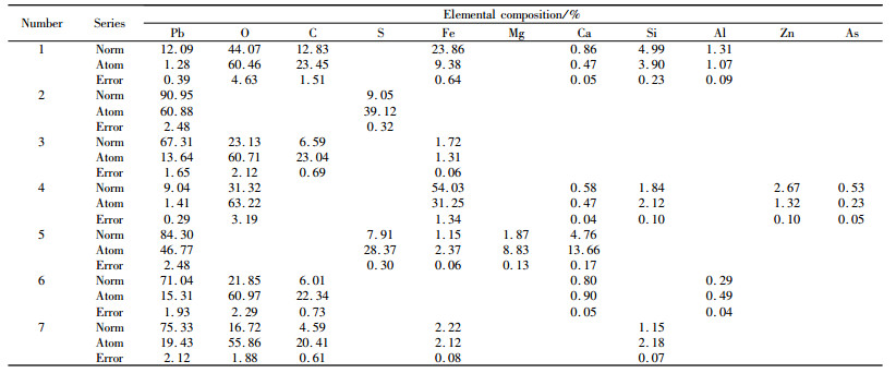 3.3 EDS点能谱分析根据图 4和表 4分析结果可知:1#点为菱面体结构,该单体以菱铁矿(FeCO3)为主的颗粒,Pb分布于菱铁矿中;2#点为立方体结构,该单体以方铅矿(PbS)为主的颗粒;3#点为斜方体结构,该单体以白铅矿(PbCO3)为主的颗粒;4#点为块状土状结构,该单体以褐铁矿(Fe2O3)为主的颗粒,Pb分布于褐铁矿中,并嵌布少量Ca、Si、Zn、As等元素;5#点为立方体结构,该单体以方铅矿(PbS)为主的颗粒;6#、7#点均为块状颗粒,是以白铅矿(PbCO3)为主的颗粒。