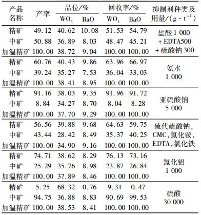 由表 7可以看出,加温精矿中石英含量极少,加温精选中石英得到了很好的抑制,但重晶石、方解石、磷灰石和长石却得到了不同程度的富集,尤其是重晶石可浮性极好,富集了10倍以上。为了得到更高品位的钨精矿,尝试对重晶石进行抑制,对白钨矿和重晶石进行浮选分离。