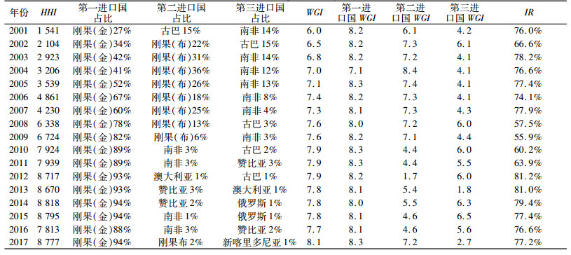 表 3 2001—2017年我国钴进口安全指标计算结果 Table 3 Indicators of cobalt import security from 2001 to 2017 |