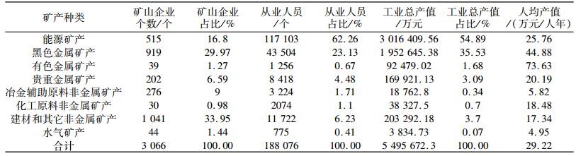| 表 1 2017年河北省不同矿种矿产资源开发利用情况 Table 1 Development and utilization for different kind of mineral resources in Hebei province in 2017 |