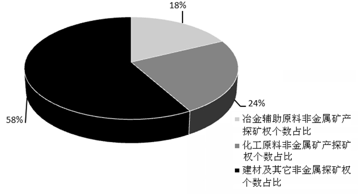 | 图 1 2016年全国各类非金属矿产探矿权个数占比情况 Fig.1 The number of national all kinds of non-metallic mineral exploration right and proportion in 2016 |