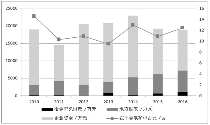 | 图 10 2010—2016年全国冶金辅助原料非金属矿产勘查投资及占比变化 Fig.10 The investments of national metallurgical auxiliary materials non-metallic mineral exploration and the proportion changes in 2010— 2016 |