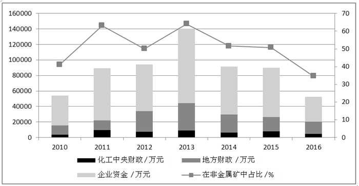 | 图 11 2010—2016年全国化工原料非金属矿产勘查投资及占比变化 Fig.11 The investments of national non-metallic mineral exploration chemical raw materials and its ratio changes in 2010— 2016 |