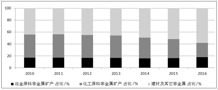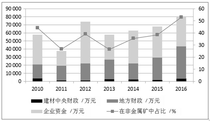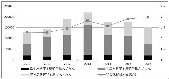 | 图 9 2010—2016年全国各类非金属矿产勘查投资及在非金属矿投入在非油气矿产勘查投资占比变化 Fig.9 The investments of national all kinds of non-metallic mineral exploration and ratio change of non-oil and gas mineral exploration investments in 2010— 2016 |