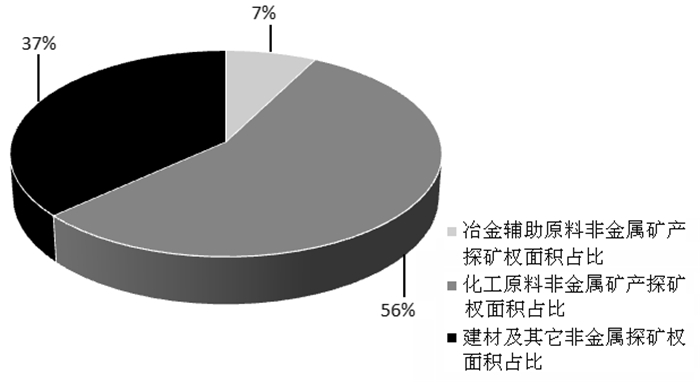 2016年中国非油气探矿权总面积为46.30万km2。其中,非金属矿产探矿面积为3.52万km2,占全国非油气探矿权总面积的7.6%。按非金属矿类分,冶金辅助原料非金属矿产探矿权面积为0.27万km2,占全部非金属探矿权面积的7.7%;化工原料非金属矿产探矿权面积最大,为1.96万km2,占全部非金属探矿权面积的55.7%;建材及其它非金属矿产探矿权面积为1.29万km2,占全部非金属探矿权面积的36.7%(图 2)。