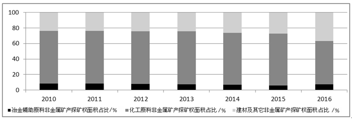 | 图 4 2010—2016年全国各类非金属探矿权面积占比 Fig.4 The national non-metallic mineral exploration area proportion in 2010— 2016 |