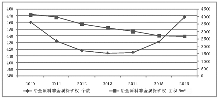 2010年全国冶金辅助原料非金属矿产探矿权有460个,2011年以来数量逐年减少,到2013年减少到最低为414个。2015年开始恢复增长,到2016年增加到468个,超过其2010年探矿权数量。但探矿权面积从2010年以来逐年减少,从2010年4 124.57 km2减少到2016年的2 659.97 km2,减少了35.5%(图 5)。