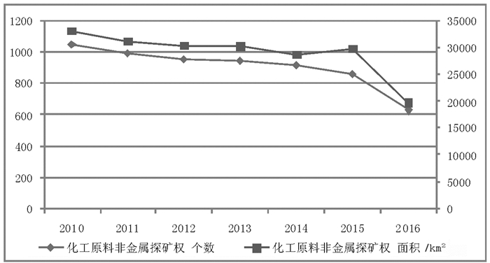 2010年全国化工原料非金属矿产探矿权数量有1 047个。进入“十二五”以来,其探矿权数量逐年减少,到2015年减少到最低为859个。进入“十三五”,化工原料非金属矿产探矿权数量减少较快,到2016年底探矿权数量减少到626个,2016年一年减少的探矿权数量超过前五年减少的探矿权数量。其探矿权面积也相应逐年减少(图 6)。