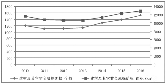 | 图 7 2010—2016年全国建材及其它非金属矿产探矿权变化情况 Fig.7 The national building materials and other non-metallic mineral exploration right changes in 2010— 201 |
