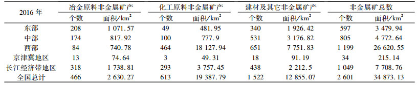 | 表 1 2016年各类非金属矿产探矿权区域分布情况 Table 1 The distribution of kinds of non-metallic mineral exploration area in 2016 |