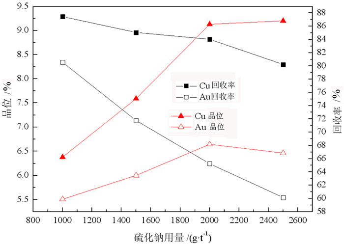 试验结果表明,随着硫化钠用量增加,铜精矿铜品位和回收率呈上升趋势,当用量达到2 000 g/t,此时铜和金品位及回收率均较大,进一步增加用量,铜有所抑制,因此硫化钠用量2 000 g/t较为适宜。