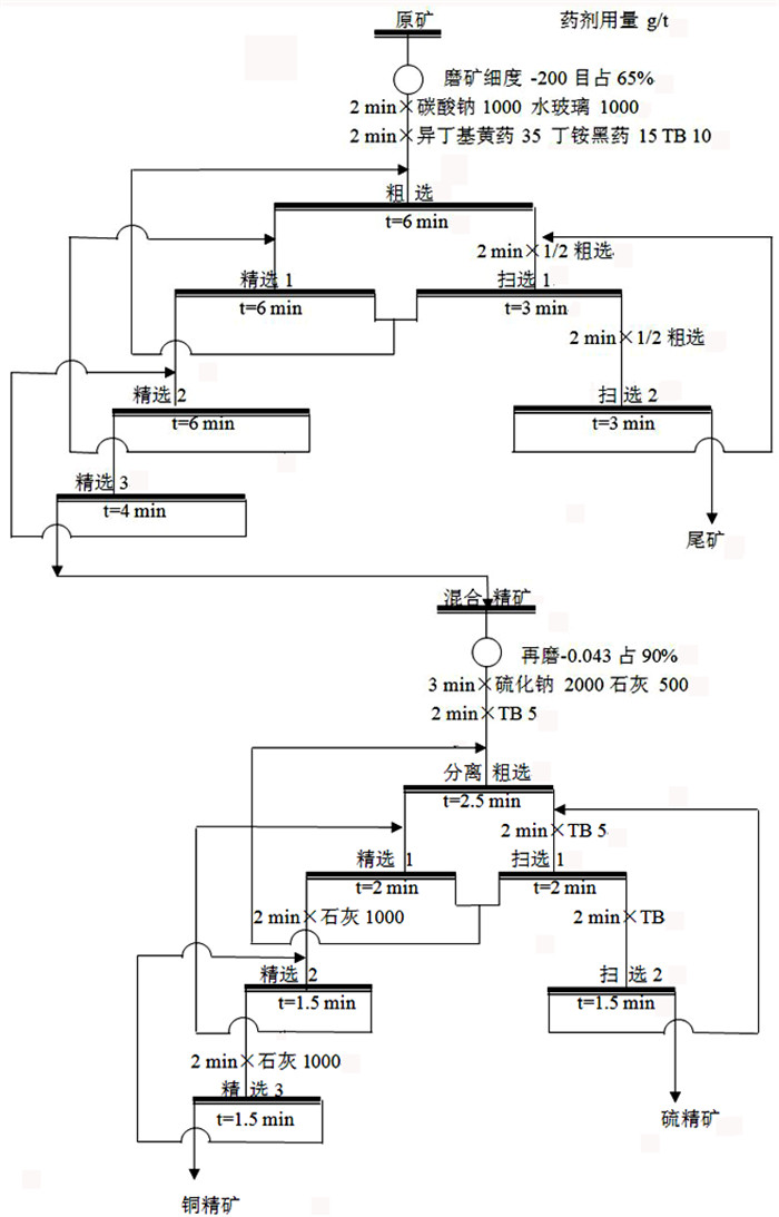 2.5 铜硫分离闭路试验在条件试验基础上,进行了铜硫分离闭路试验。全流程试验,如图 10所示,其结果见表 6。