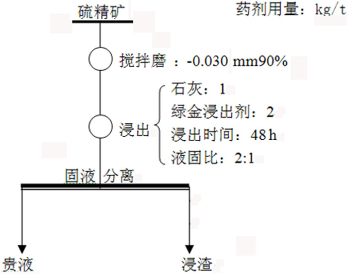 铜硫分离硫精矿金品位为1.24 g/t,金相对原矿损失率20.78%。岩矿鉴定表明,硫精矿中的主要矿物为黄铁矿,金被黄铁矿紧密包裹[3]。本研究采用新型环保浸出剂—绿金浸出剂进行浸金[8-9],由条件试验确定了再磨细度、浸出剂用量、碱用量、浸出时间和矿浆浓度等工艺条件,图 11所示为最佳工艺条件下的浸出试验流程。