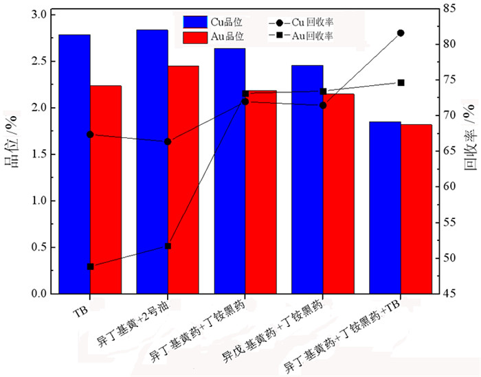 | 图 2 捕收剂种类对粗选指标的影响(TB 40 g/t;异丁基黄药+2号油40+20 g/t;异丁基黄药+丁铵黑药40+20 g/t;异戊基黄药+丁铵黑药40+20 g/t;异丁基黄药+丁铵黑药+TB 40+20+10 g/t;Au品位为g/t) Fig.2 The effect of collector types on flotation |