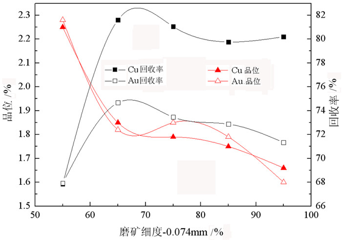 | 图 3 磨矿细度对浮选指标的影响(Au品位为g/t) Fig.3 Effect of grinding fineness on flotation results |
