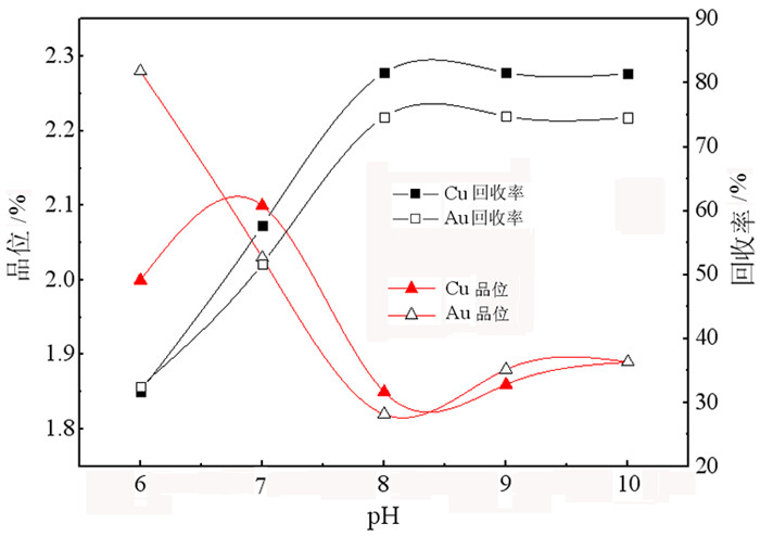 | 图 4 pH对精矿指标的影响(Au品位为g/t) Fig.4 Effect of pH on flotation index |