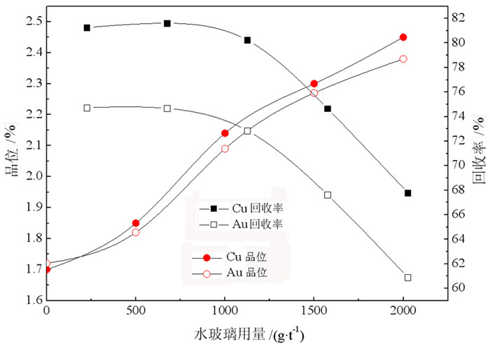 图 5结果表明,随着水玻璃用量增加,粗精矿铜和金回收率逐渐降低,而品位逐渐升高,选取1 000 g/t较为适宜。