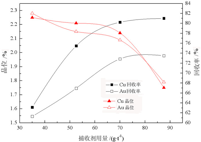 | 图 6 捕收剂用量对浮选指标的影响(Au品位为g/t) Fig.6 Effect of collector dosage on flotation index |