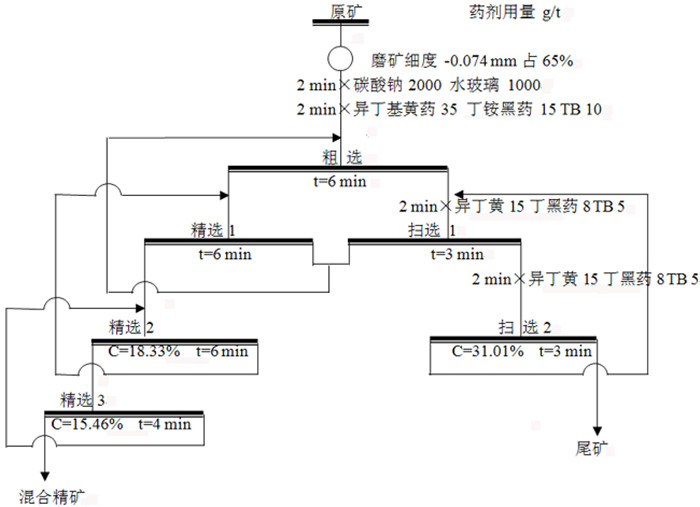 | 图 7 混合浮选闭路试验工艺流程 Fig.7 The flowsheet of bulk flotation closed-circuit tests |