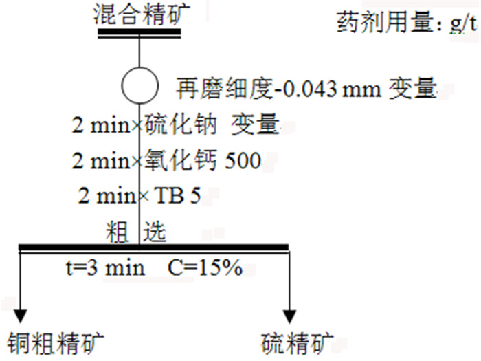 为获得合格品级的铜精矿,开展再磨细度及脱药剂用量条件试验,采用氧化钙作为黄铁矿抑制剂,添加少量TB作为铜捕收剂[6-7],原则工艺流程见图 8。