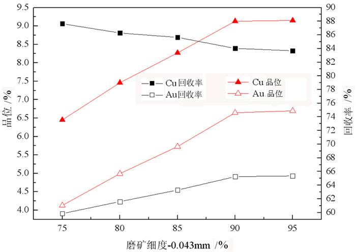 试验结果表明,随着再磨细度增加,铜硫矿物解离度增加,分离粗精矿铜和金品位逐渐升高,当细度达到-0.43 mm含量90%,分离粗精矿铜金品位较高,此时回收率也保持在较高水平,进一步增加铜金指标趋缓。