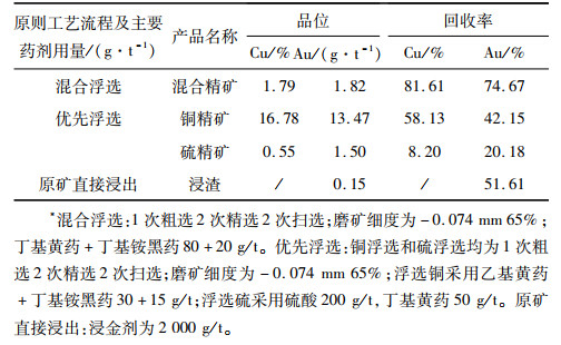 为初步探明原矿中铜和金的可选性,在工艺矿物学研究基础上,采用混合浮选、优先浮选和原矿浸出金探索试验[4],试验结果见表 4。