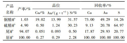 (2) 根据矿石特性,采用混合浮选—铜硫分离工艺,综合回收了矿石中有价矿物:获得铜和金品位分别为19.02%和13.99 g/t,铜和金回收率分别为73.00%和49.29%的铜精矿;硫精矿通过再磨氧化浸金工艺,金浸出率14.92%,金总收率64.21%,浸渣硫品位30.23%,可作为硫精矿销售。该工艺具有成本低和药剂制度简单等优势。