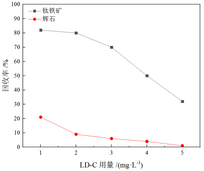 水玻璃、草酸、LD-C药剂用量对钛铁矿与辉石浮选性能的影响分别如图 4 ~图 6所示。由图 4可知,随着水玻璃用量的逐渐增加,钛铁矿与辉石的回收率逐渐降低,表明水玻璃对钛铁矿和辉石皆有一定的抑制作用,若要强烈抑制辉石需要较大的药剂用量,但钛铁矿回收率也可能因此大幅度降低,因此以水玻璃作抑制剂的浮选分离效果较差。由图 5可以看出,草酸对钛铁矿与辉石都具有较为明显的抑制作用,草酸用量为20 mg/L时,钛铁矿、辉石回收率分别为72%、10%;而当草酸用量为40 mg/L时,辉石的回收率降低至4%,但此时钛铁矿的回收率仅有38%。因此以草酸为抑制剂时,在较低的药剂用量水平下可以达到一定的分离效果,但效果并不显著。