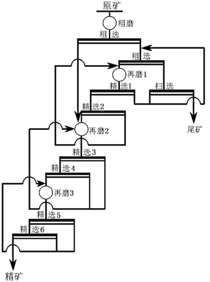 常规工艺由于对大鳞片石墨与细粒石墨采用混合磨矿,且大鳞片石墨要经过每一段再磨,因此人为损失大鳞片情况最为严重。目前,常规工艺仍是我国石墨矿山企业普遍采用的工艺,经优化改造后在一定程度上提高了精矿中大鳞片产率,采用新型的磨矿设备强化了再磨过程降低功耗,提高了选厂的生产能力。但该工艺未能很好的解决直接对原矿进行粗磨时硬质脉石矿物对石墨鳞片的破坏作用[32, 38];同时由于大鳞片石墨与细粒石墨混合磨矿,磨矿作用以解离大鳞片石墨为主,为提高细粒石墨的解离,往往需要增加磨矿段数,这就对已解离大鳞片石墨造成破坏。该工艺普遍存在精矿正目率不高、工艺冗长、中矿返回量大、生产不易控制等缺点。