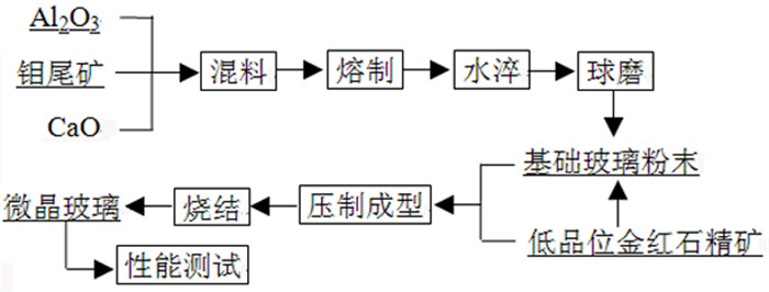 1.2 试验步骤基于钼尾矿成分特点,参考前期试验结果,设计CAS系微晶玻璃配方为(质量分数):60%钼尾矿、20%分析纯CaO、20%分析纯Al2O3,基础玻璃的主要氧化物组成见表 3。