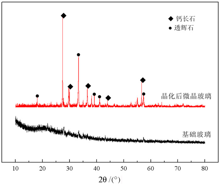 对基础玻璃和微晶玻璃分别进行X射线衍射分析,见图 2。可以看出,基础玻璃无明显衍射峰,说明钼尾矿经熔化水淬后形成了非晶态物质,导致结晶相消失。而微晶玻璃却有明显衍射峰,说明基础玻璃经压制成型烧结后形成了晶态物质,结晶相为钙长石和透辉石[15]。