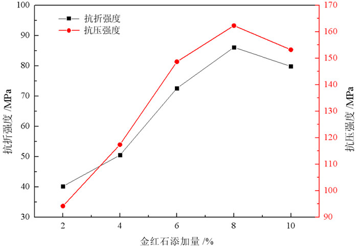对不同低品位金红石精矿添加量条件下烧制的钼尾矿微晶玻璃进行抗压强度、抗折强度测试,结果见图 3。
