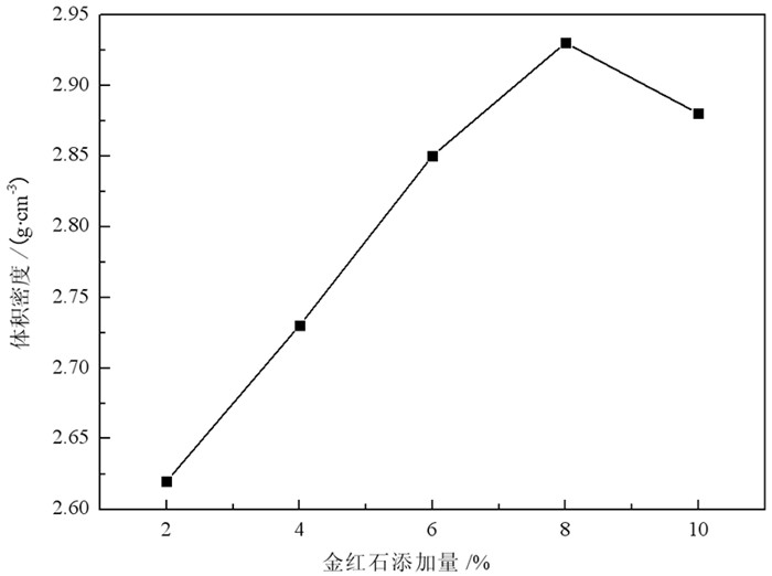| 图 4 金红石添加量对微晶玻璃体积密度的影响 Fig.4 Effect of addition amount of rutile on volume density of glass ceramics |